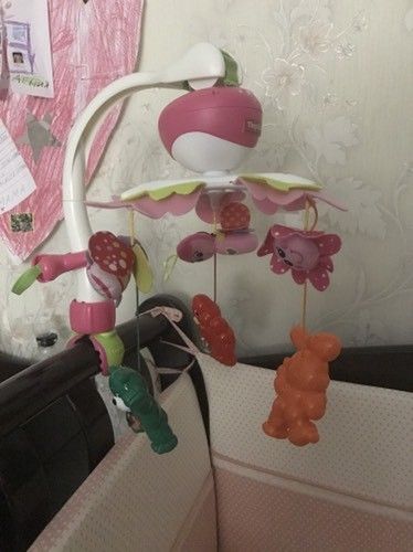 мобиль за 1600 заводной фирмы мир детства — до 5.5 мес очень нравился смотрел и ручки тянул — сейчас просто уже встает в кровать убрали его! в сторону иногда дергает за них!