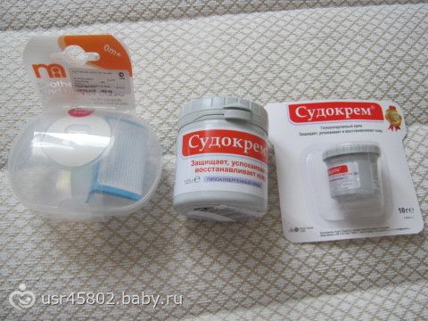 контейнер для сосок и крем под подгуз (судокрем), а маленький дали в подарок)