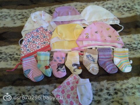 10.Носочки и чепчики-по 2 пары трех размеров, царапки только одни, т.к. на большинстве распашонок они уже есть...