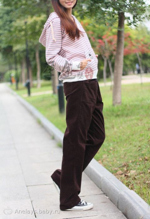 Они вельветовые, коричневые (реальный цвет оказался намного темнее чем у продавца) с толстой байковой подкладкой (минус в том что вся пыль цепляется и кошачьи волосы) от подкладки штаны кажутся объемными: