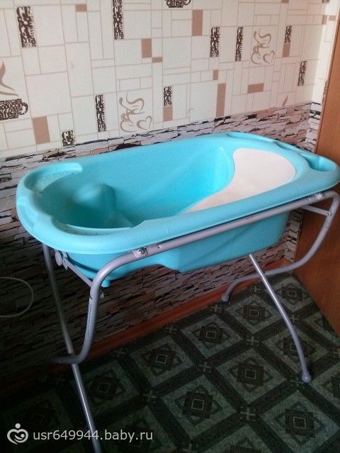 3) Купали в ванночке где-то до 9 месяцев. Т.к. сначала из-за грыжи нельзя было. Потом когда прооперировали, с двух месяцев пытались купать в круге, но он с непривычки пугался. Ванночку еще до родов купили со встроенной горкой, большую (с одной стороны горка, с другой можно сидеть) + подставка металлическая, чтобы спина не болела у нас. Заказывали это в Энтере. Ванночка около 400 рублей, и подставка столько же где-то.