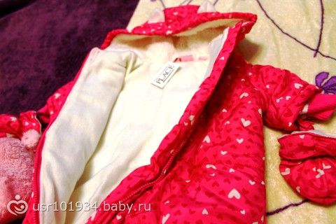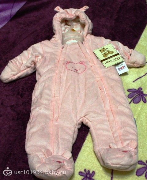 Этот комбинезон тоже покупался на холодную весну, более тонкий и лёгкий, чем зимний. Ручки и ножки закрываются. Комбинезон оказался довольно большой для размера 3-6 месяцев, поэтому, возможно, хватит и на осень: