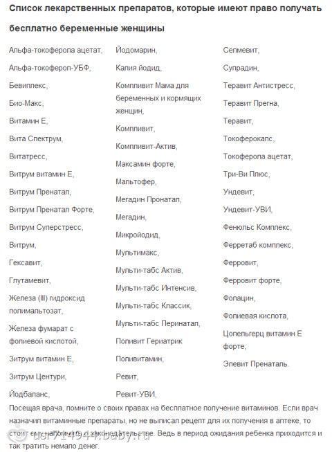 Мне что в первую беременность врач просто продиктовала список необходимых витаминов и лекарственных препаратов, что во вторую. врачи разные были, но не одной и в голову не пришло бесплатный рецепт мне выписать(( Причем в последний раз список препаратов был более чем на 3тр. Самой же мне неудобно спросить об этом врача… наверное молчу потому что пока работаю и все это не «бьет особенно сильно по карману»