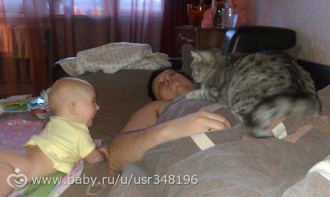 Да по фигу на мой живот было моему Ральфу. К новорожденной тоже был равнодушен: ну лежит и лежит, ну орёт. Изучил, обнюхал, и всё. Вот когда на пол дочь перебралась, ему стало интереснее. Теперь она ему игрушки носит, Ральф, когда радуется нашему приходу, лапы ей на плечи ставит, она его тискает. Присматриваю только, чтобы случайно не ударила его, он не пытается обижать. Только вот у собаки аллергия появилась. Видимо, все же переживает появление нового члена стаи, которому отдают очень много внимания.