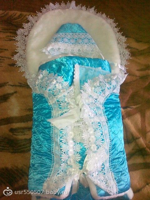 У нас родится в конце декабря-январе..., мои купили уже такой конверт: материал-дышащая мембрана, отделка- овчина мериноса и шерсть мериноса+там одеяло из эковолокна( типа холофайбер), капюшон отстегивается, утягивается по размеру головки.Почему то снохе не нравятся кружева и рюшечки..., но конверт-оч. нарядный!!! Правда цвет немного искажен...