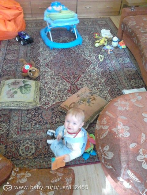 Сидит пока готовлю, или надо отойти недолго, а так либо сама на полу ползает или сейчас очень долго в ходунках бегает, сама в них проситься