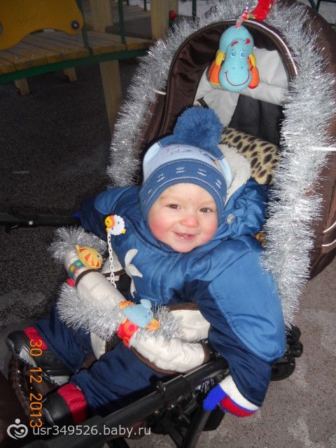 колясон наш новогодний, елку наряжала 30 и мишура осталась, вот и с креативничала-мне нравится и прохожим, ну а Тим подергал мишуру, и успокоился-в варежках неинтересно… встретили соседей с уже взрослым ребенком-они салют шли покупать, выпили по чуток шампусика для настроения)))) Тимофей порадовал маму-я ему иду и говорю-«ля-ля-ля» а он в ответ поет!-ляяяяя-ля-ля-ляяяя-ля")))))таким милым голоском)))так и пели всю прогулку)))