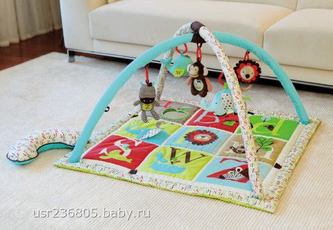 У нас есть всевозможные погремушки, в том числе в виде браслетика на запястье, мобиль и три «виселки» на дугу в автокресло. В последнее время мы нежно полюбили наш развивающий коврик Skip Hop – вот, решила им похвастаться, а заодно спросить, кто еще чем развлекает и развивает деток нашего возраста?
