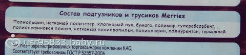 Заходим в обычный детский магазин. И если мы встретим подгузники «MERRIES», поставляемые компанией «Градиент», закупающей эти подгузники у японской компании — производителя «КАО», то ознакомившись с информацией на этикетке, узнаем о подгузнике ПРИМЕРНО СЛЕДУЮЩЕЕ — «… внешнее покрытие подгузников и трусиков Merries состоит из нетканого материала, внутреннее — хлопковый пух и суперабсорбент». Насколько нам удалось выяснить, состав подгузников и трусиков Merries: полиолефин, нетканый полиэстер, хлопковый пух, бумага, полимер-суперабсорбент, полиолефиновая пленка, нетканый полипропилен, полиолефин, полиуретан, термоклей. Они замечательны, нет слов. Нравятся многим. Но на наш взгляд они состоят на 100% из натуральных материалов, так же как, ну скажем свитер содержащий ...% шерсти, а остальное — синтетическое волокно. А можно проще сказать: « Рядом с фабрикой, на которой мой свитер связан, паслась овец отара».