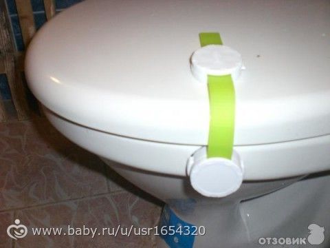 У нас специальная штучка — крепится на крышку и на сам унитаз и их соединяет эластичная штучка. Взрослый легко отстегнет, а ребёнок не сможет