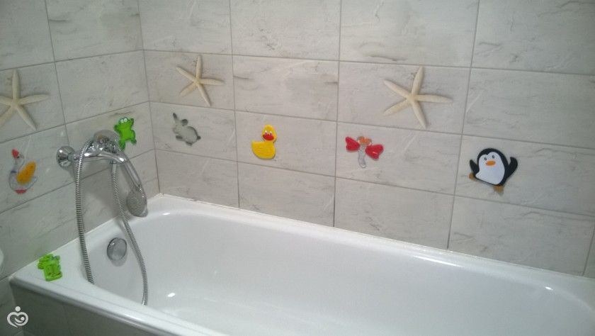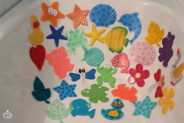 Прикрепили в ванну, чтобы при нырянии под воду можно было их разглядеть. Доче нравится, когда выныривает, то сразу улыбается
