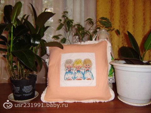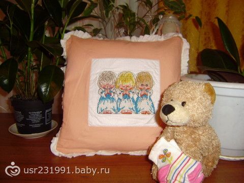 Уф… Вышила… Успела как раз к овульке)))Не судите меня строго… Но старалась от всей души… Вот и подушечку сшила… Потянула меня на персиковый цвет)))Дочку же хочу… Фотограф с меня тоже ни какой… Но постаралась все свои три фикуса, зайца Тильду-тоже своими руками, медведик и носочки купленные, ВСЕ УМЕСТИЛА НА ФОТО… Вот теперь надеюсь.