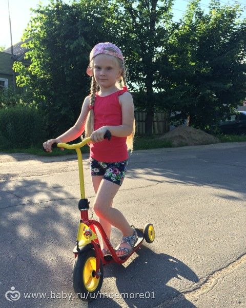 Купили как микро, самый обыкновенный без наворотов. Дочке очень нравится. Катается с 1,10, как потеплело так и купили. Не учили, она сразу встала и поехала, насмотрелась на других деток. Лучше брать с двумя колесами впереди, как раз таки лучше устойчивость!