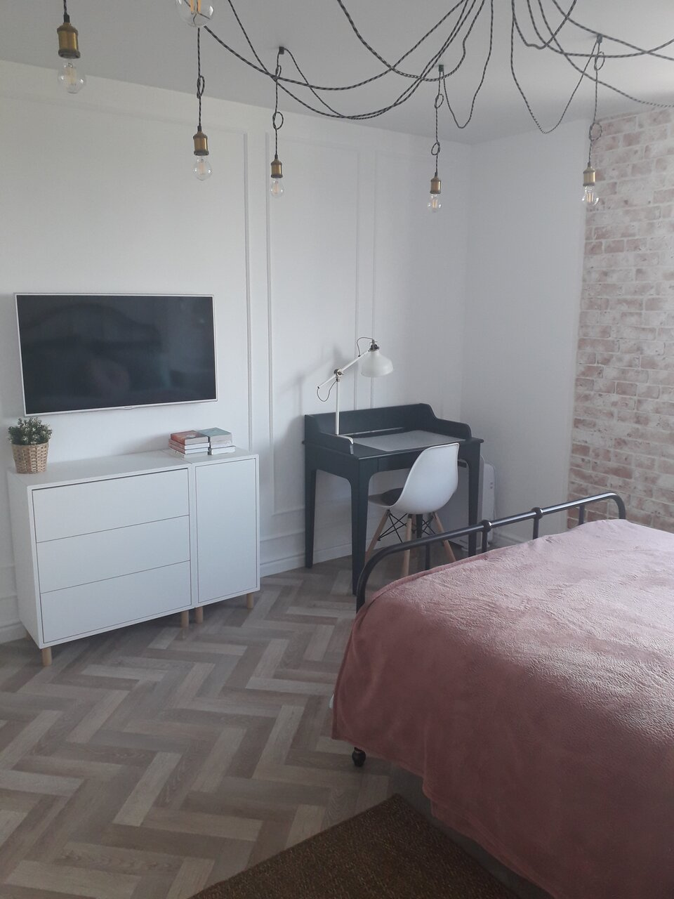 Мне не нравится пол и потолок смысле лампочки, и тюль белую бы
