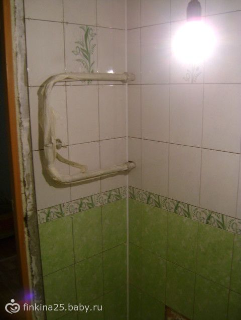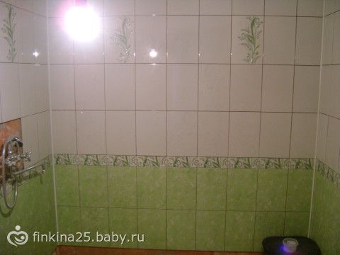 Плитка на фото получилась бледнее чем есть, на самом деле она цвета зеленого яблока — это нижний пояс, верхний — белая перламутровая. Я в магазине с первого взгляда влюбилась в эту плитку и ничего другого больше не хотела.