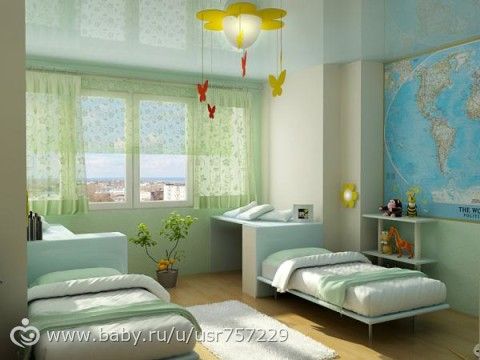 ну и красота в моем понимании, очень нравиться белая мебельох, как я люблю проекты))) щас правда,2 проекта параллельно делаю. У тебя комната 12 квадратов, высота 2,50 до потолка, я смотрю. Не делай 2-х этажную кровать. Лучше 2 раздельные, или такую, чтоб потом ее на 2 можно было разделить. На мой вкус — цветовая гамма лучше на второй картинке, но эт я люблю зеленый и сиреневый просто.стол хороший, экономит место. Можно сделать стол вдоль стены сразу со стеллажами, где хранить учебники и все остальное. вот такой вариант — как раз дверь напротив окна.Помещение 12 кв.м. И кровать с тумбами внизу.