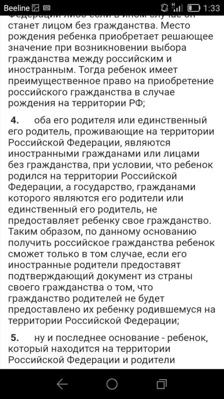 Ну сказали нет такого, что ребёнок если родился в РФ может стать гр. россии… Для этого сказали основания нужны, или мама или папа должны быть гр.россии, потом отправили в ФМС и т.д