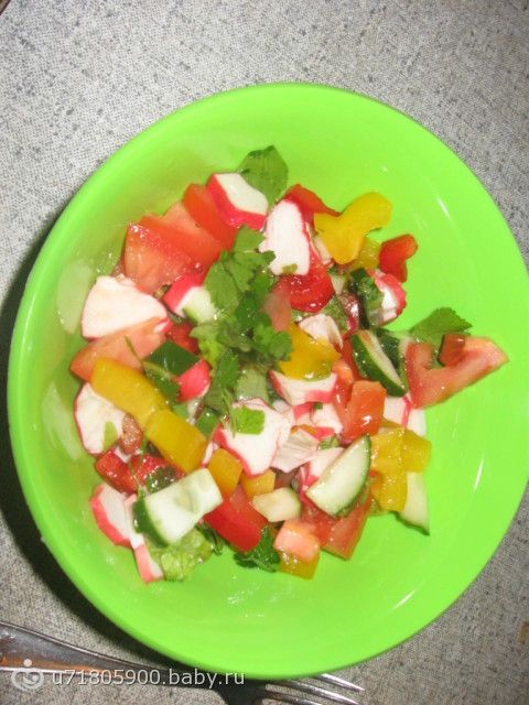 Необходимые продукты: огурец, помидор, желтый и красный болгарский перец-по 1 шт.; крабовые палочки 5-7 шт.; зелень(петрушка, сельдерей), соль по вкусу, растительное масло для заправки.