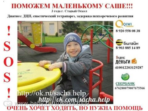 Девочки, уже не знаю, где ещё написать просьбу о помощи моему сыну. Дело в том, что у него дцп и мы собираем на первый курс лечения в Китае, который должен состоятся со 2 марта 2015г., сумма к оплате за два месяца реабилитации 8315$. Курс доллара постоянно растёт и без посторонней помощи нам не обойтись. И ждать мы не можем, так как в лечении дцп время играет против детей. Наш сын, Саша родился на 30 нед. 990гр. 32см. Выписали домой почти через 3 месяца с кучей диагнозов (ретинопатия1-2степени, атрофия зрительного нерва, глухота и ещё полный набор неврологических болезней). В 6 месяцев нам поставили диагноз в этом возрасте. В 5 месяцев у Саши появилось зрение (стал следить за игрушками), ретинопатия регрессировала, в 7 месяцев начал слышать. Сейчас нам 3 годика мы умеем держать голову, брать игрушки, переворачиваться, ползать по пластунски, самостоятельно встаёт на четвереньки и начал потихоньку ползать (после первого курса в Трускавце), есть с ложки, всем интересуется- очень активный, любознательный, очень любит машины (настоящие), особенно сидеть за рулём (интеллект сохранен), машет пока, даёт ручку, хлопает в ладоши, танцует под музыку головой и ручками, ещё Саша очень хорошо умеет драться если его не слушают, что-то говорит на своем языке (четко говорит «дай», «на» и «отдай») — динамика положительная. Мы постоянно что-то делаем (массаж, глубокий мышечный массаж, ЛФК, обкалывание по точкам, иглоукалывание, электростимуляция мозга, бассейн, занятия с логопедом, остеопатия, кинезотерапия, иппотерапия, нейрокоррекция, медикаментозное лечение), стараемся успеть до 5 лет компенсировать возможности организма (потом процент восстановления гораздо меньше). Если Вы зарегистрированы в соц.сетях пожалуйста присоединяйтесь к группе моего сына и https://ok.ru/sacha.help и приглашайте своих знакомых, может кто-то из них сможет помочь финансово.