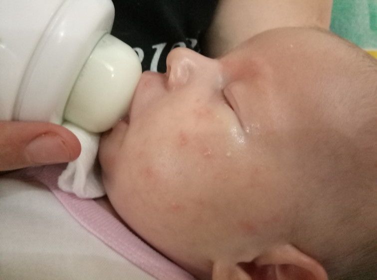 полностью на ив, на нэнни неделю, на второй день появился один прыщик, я думала может на то что смесь течет когда ест?! но сегодня пошло дальше