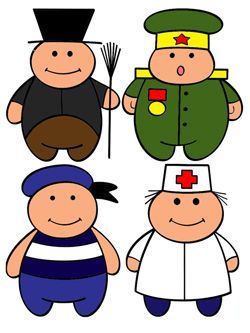 трубочист – инструменты для чистки трубы; маляр – краска с кистью; швея – швейная машина; врач – градусник; художник – палитра с кисточками; продавец – кассовый аппарат; пастух – собака и лопата; автомеханик – гаечные ключи; пекарь – скалка; учитель – школьная доска; фермер – трактор; архитектор – сантиметровая лента и карандаш; повар – кастрюля; кузнец – наковальня; доктор – стетоскоп; сантехник – плоскогубцы; парикмахер – ножницы и расческа; секретарь – печатная машинка; садовник – лейка; фотограф – фотоаппарат; стоматолог – кресло с бором; плотник – рубанок; артист – гитара; фармацевт – ступка; строитель – мастерок; артист цирка – ленты, мячи, булавы.