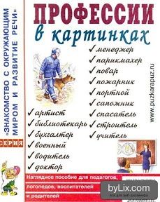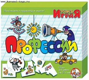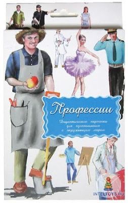 4. Карточки «Профессии» серии Учимся читать с пеленок. Покупала в «Маленьком гении» 24 карточки профессий и 24 карточки инструментов, необходимых для этих профессий, 1 карточка со стихами. Терапевт-стетоскоп, модельер-манекен, фотограф-фотоаппарат, пожарный-топор, повар-кастрюля, пекарь-скалка, секретарь-ручка, тренер-свисток, учитель-тетрадь, телеоператор-видеокамера, слесарь-ключ, химик-колба, официант-кофе, визажист-помада, закройщик-ножницы, строитель-каска, столяр-гвоздь, актер-маска, дирижер-ноты, парикмахер-фен, модель-платье, хирург-скальпель, библиотекарь-книга, скрипачка-скрипка.
