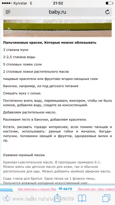 Кинетический песок, своими руками. 8 мая 2016 14:43 Кто делал, у вас получился как магазинный? Делала тесто, снег, краски пальчиковые… все рецепты из Интернета. Все получалось:) а вот за песок, сомневаюсь) Комментарии Пожалуйста, будьте вежливы и доброжелательны к другим мамам и соблюдайте правила сообщества ПожаловатьсяСкопировать ссылку Letka Виктория12 лет Киев кинетический песок — это сейчас одна из самых интересных штук для деток. я сама могу в него играться))))) самодельный не практиковала еще ПожаловатьсяСкопировать ссылку Goldмама Сентябрёнок12 летДекабрёнок10 лет ↩ Letka Letka, Я тоже играюсь))) нервы успокаивает))) и пластилин такой есть у нас, прям на пинопласт похож, тоже им нервы успокаиваю. ПожаловатьсяСкопировать ссылку annettochka Алексей10 летМаруся8 лет Москва Не делала такие штуки. Интересно! ПожаловатьсяСкопировать ссылку Инна Шахты Простите, не по теме. А как краски делали?ПожаловатьсяСкопировать ссылку Goldмама Сентябрёнок12 летДекабрёнок10 лет ↩ Инна Иннуська, ПожаловатьсяСкопировать ссылку Инна Шахты Goldмама, Спасибо большое)Кстати, кинетический песок на сайте mytoys от 385р ПожаловатьсяСкопировать ссылку Любовь Степан9 летУльяна14 лет Красноярск Послушаю Следующая статьякак избежать истерики?