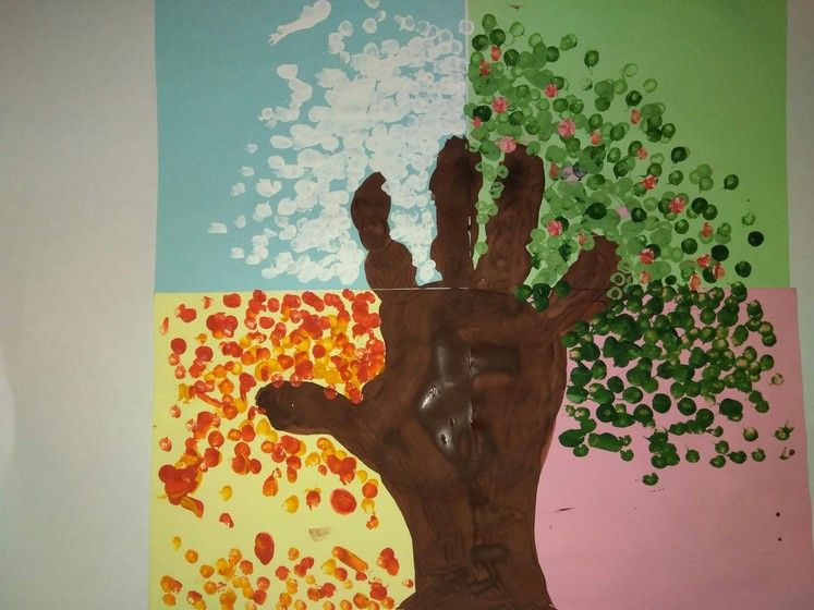 И в заключении мы создали вот такую яблоню (ствол – отпечаток Славиной ладошки, листья рисовали ватными палочками).