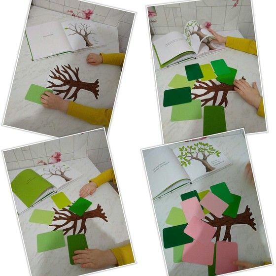 После прочтения книги у нас было замечательное настроение. Мы решили проиграть сюжет еще раз. С помощью арт-конструктора и карточек-оттенков из «Творчества с пеленок» мы создавали свое дерево. Подбирали цвета, раскладывали карточки, рассуждали о красоте природы. Это было очень душевно и уютно)