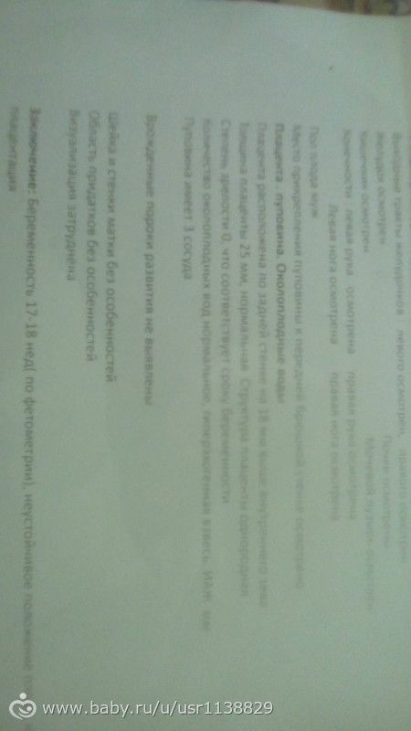 Еду с УЗИ ЦПСиР, пол предположили, но опять-таки не уверены… В общем-то меня теперь это не особо волнует. Девочки, а это плохо, что на моем сроке внутренний зев закрыт, цервикальный канал расширен до 3,8 мм и содержимое неоднородное, аваскулярное при ЦДК ?! Плюс в заключении низкая плацентация. Длина шейки 34 мм Срок 17.5Покидайте свое УЗИ на этом сроке