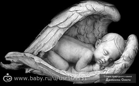 у нас вот такой ангелочек, спящий на крылышке, а надпись ни какую не делали, дороговато…Хотела надпись: Одной душой беднее небо, одной звездой богаче небеса...