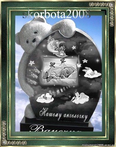 Мы заказали из белого мансуровского гранита, красивую большую тумбу а на ней будет лежать ангелок в крылышках. Вот ждем макет, чтобы одобрить.