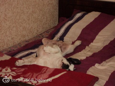 Моя францкузская бульдожка спит исключительно на постелях, конечно и храпит и пукает но она у нас член семьи