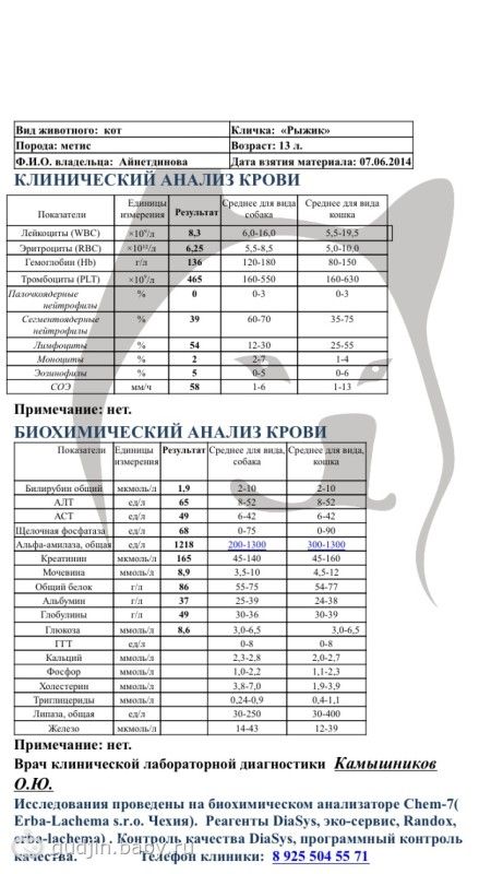 Здравствуйте! Десять дней назад я потеряла своего котика, он умер от хпн. К сожалению, мы спохватились очень поздно, на той стадии, когда животное начинает худеть и ничего не кушать. Есть у меня еще один кот. На вид бодрый, веселый, красивый кот. Но все же, я решила сдать общий анализ крови и биохимию. К моему сожалению, показатели не самые хорошие. Коту 13 лет, кастрированный, на улицу никогда не ходил. Я беременная женщина с годовалым ребенком, муж работает без выходных, в ближайшее время я не смогу посетить ветеринарную клинику. Поэтому, хотела бы спросить тут, означают ли такие показатели начальную стадию ХПН? Ведь креатинин и белок завышены, глюкоза повышена и билирубин занижен. Фото результатов анализов прилагаю. Спасибо заранее за понимание и ответ