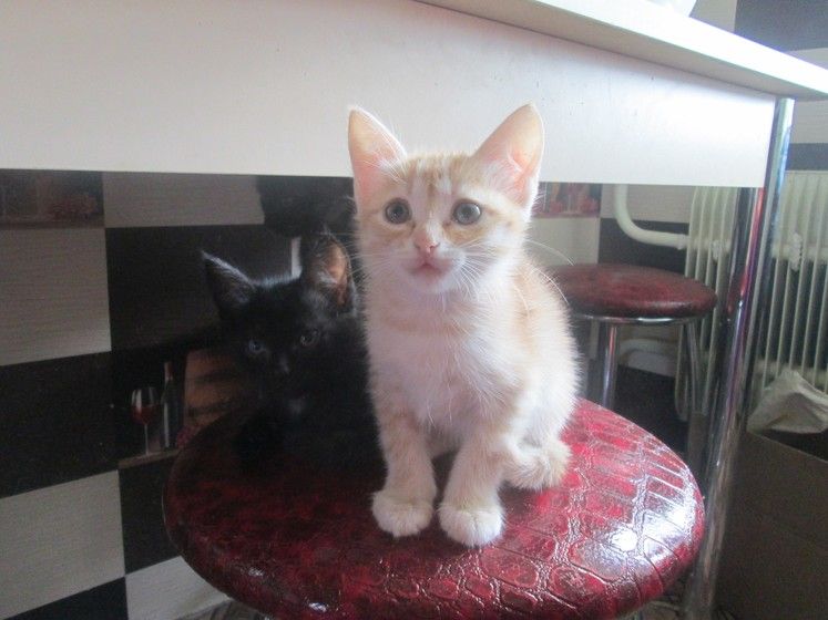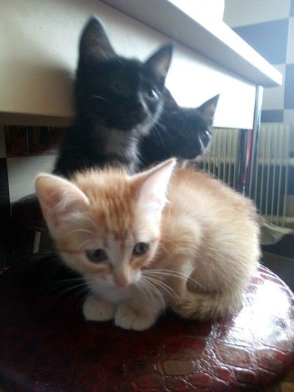 Котодеткам по 2 месяца, здоровы, лоточек знают, едят все. Один кот и две кошечки. рыжий окраса мальчик, черные девочки.
