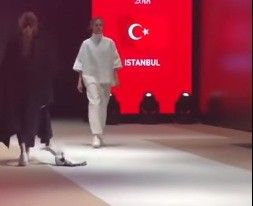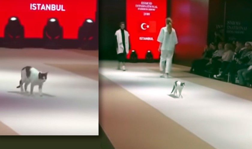 В Турции на показе мод Esmod International Fashion Show в Стамбуле произошло неожиданное событие. На подиум каким-то образом пробралась обычная дворовая кошка. Сначала она просто вылизывалась. Модели проходили мимо нее. Но одна из них шла прямо на кошку, немного свернув в последний момент. И киса не удержалась от соблазна попытаться схватить девушку за развевающуюся деталь одежды, чем вызвала особую радость у зрителей).