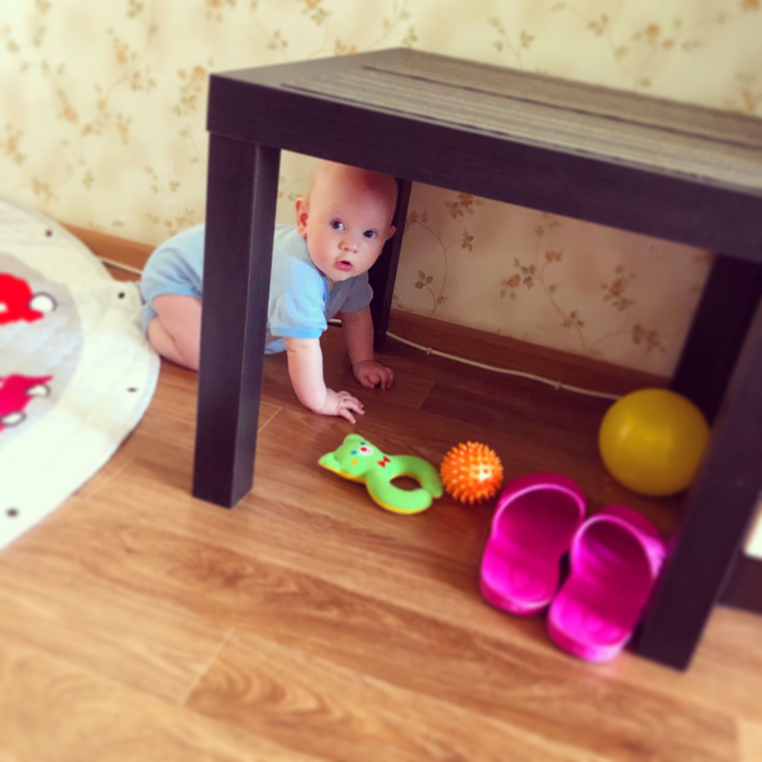 встаёт на четвереньки и ползёт (второе пока не совсем уверено)