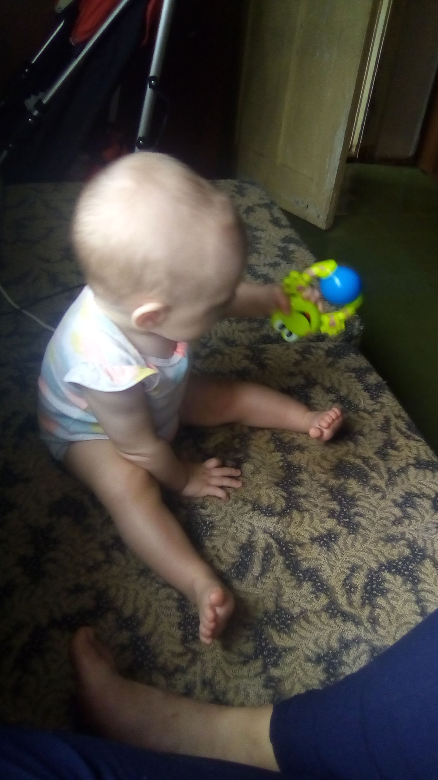 Умелки: умеет садиться сама,встаёт у опоры и ходит за ручки( в ходунках уже ходит и бегает),ползает на четвереньках,говорит ма,ба,па,авав и тити,играет в ладушки и даёт пять,отзывается на имя
