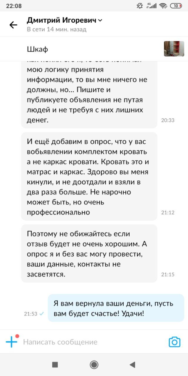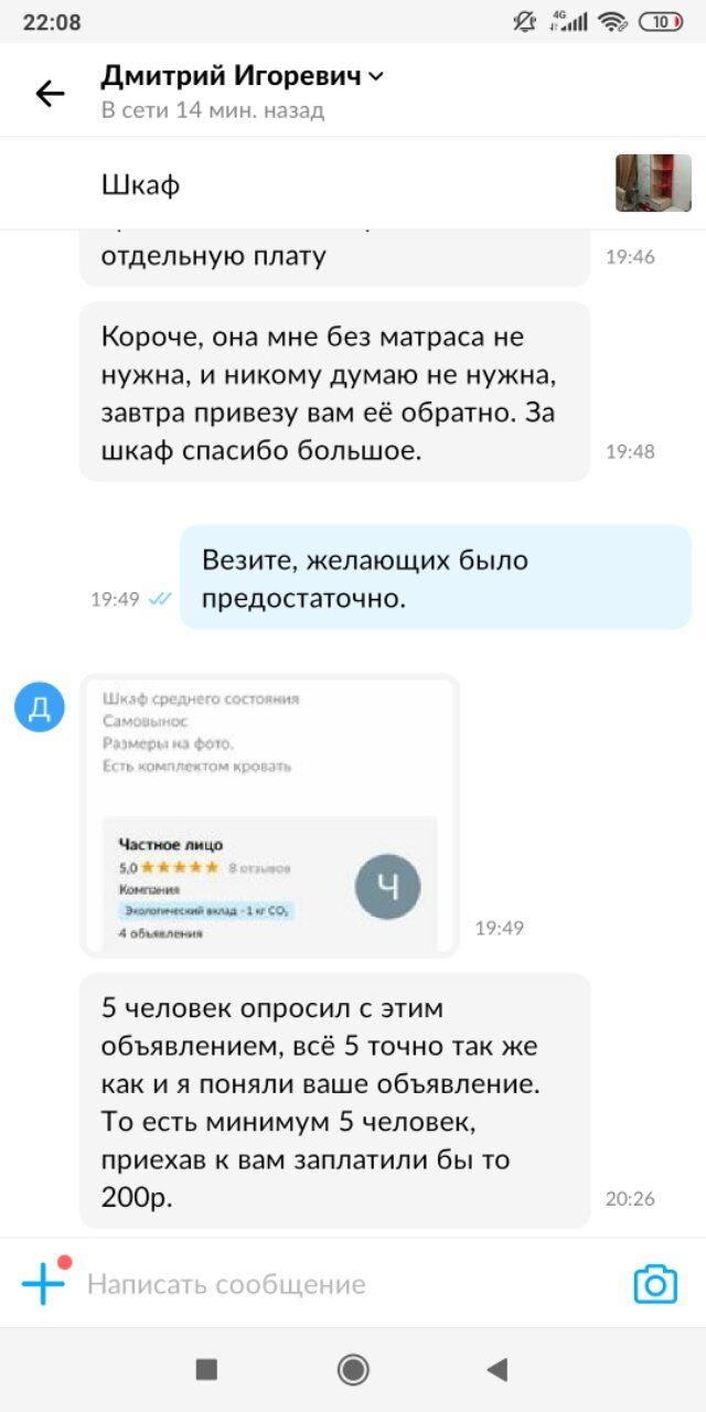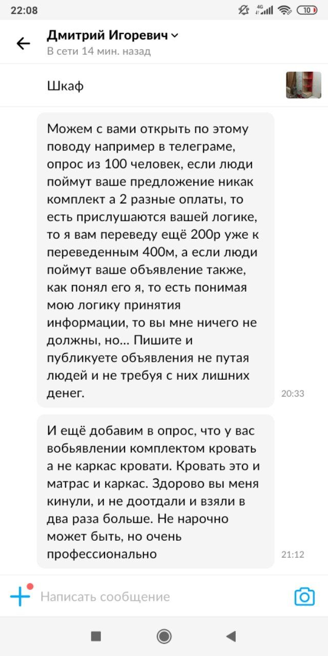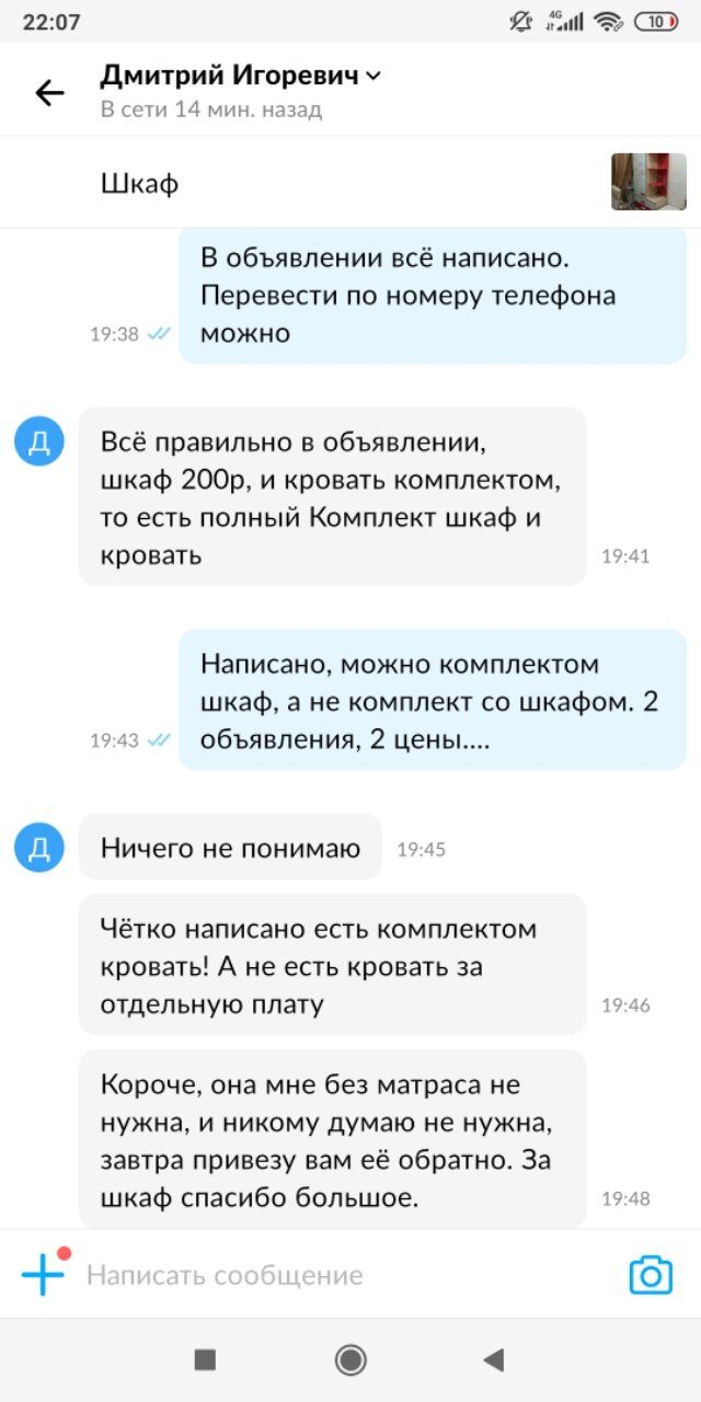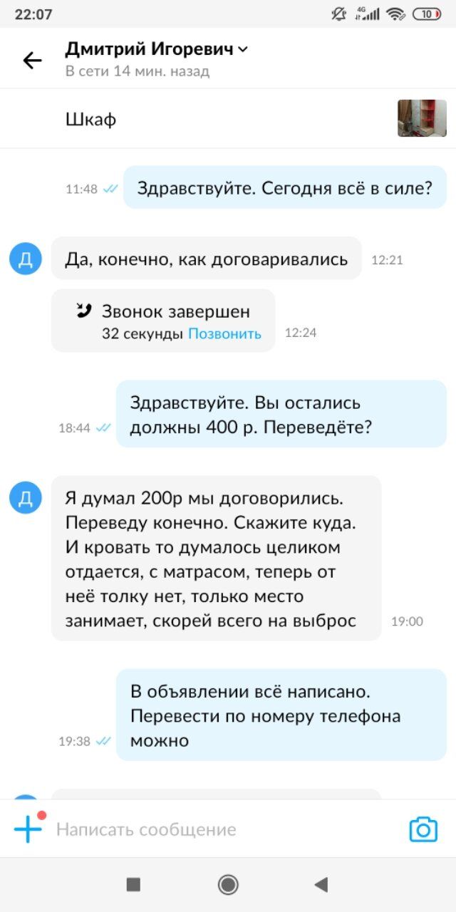 3 декабря 2022 22:24 +6 Ситуация. Рассудите кто прав. Выставила 2 объявления на авито , каждое по 200 р. Шкаф и кровать. Сразу появилось много желающих, договорилась с первым. Он отправил грузчиков, они просто забрали без денег, я написала после ему, он написал своё недовольство … Читать далее