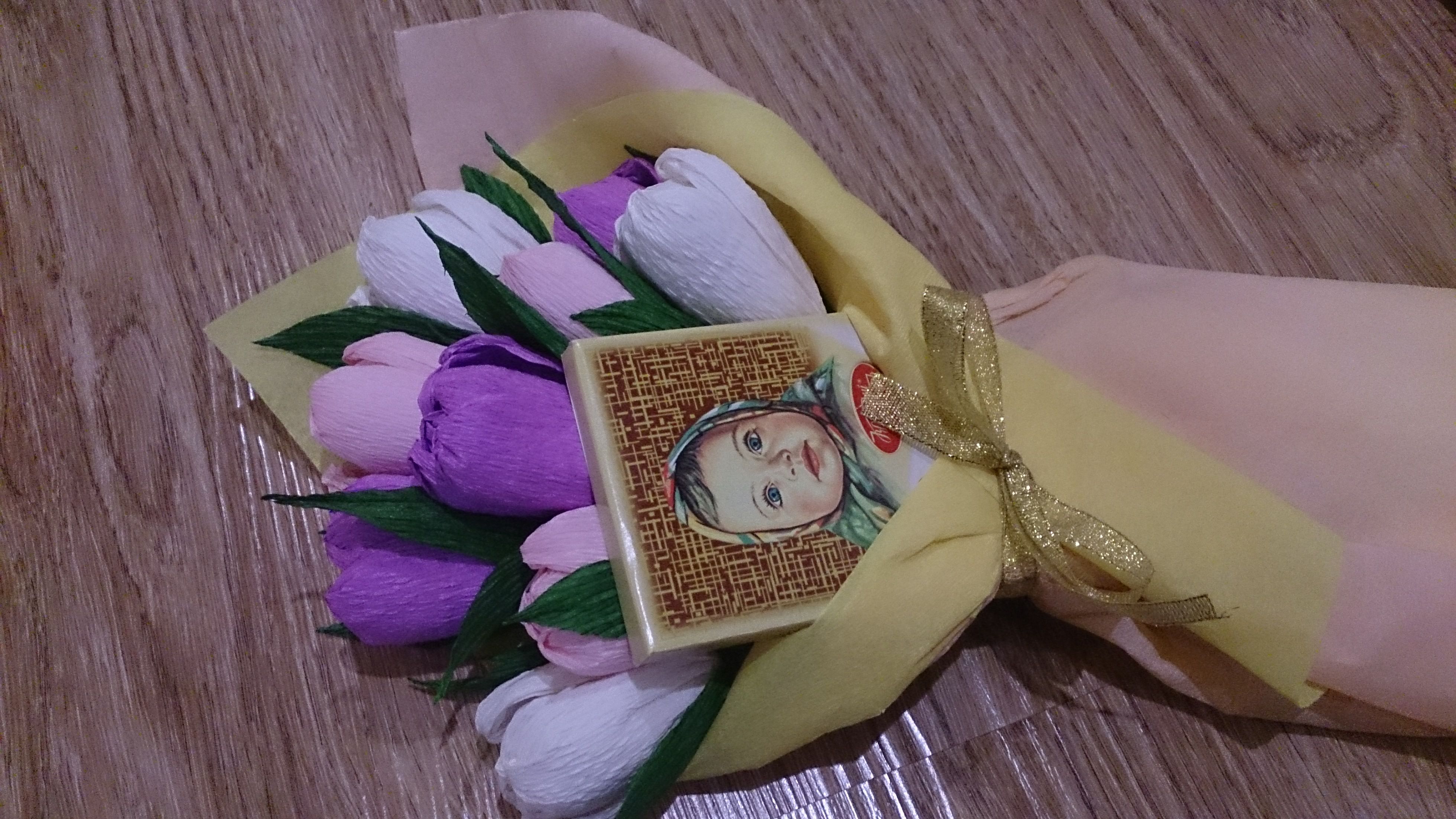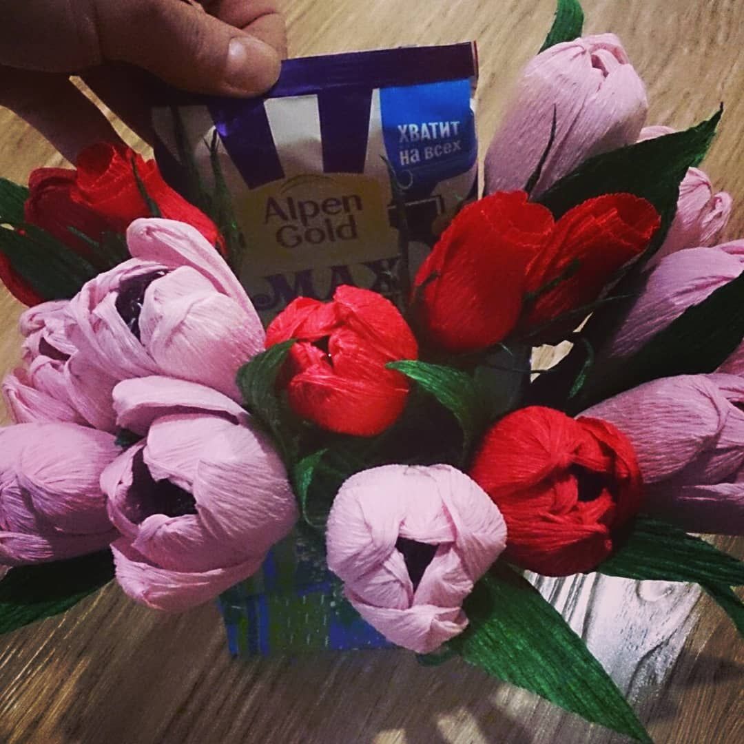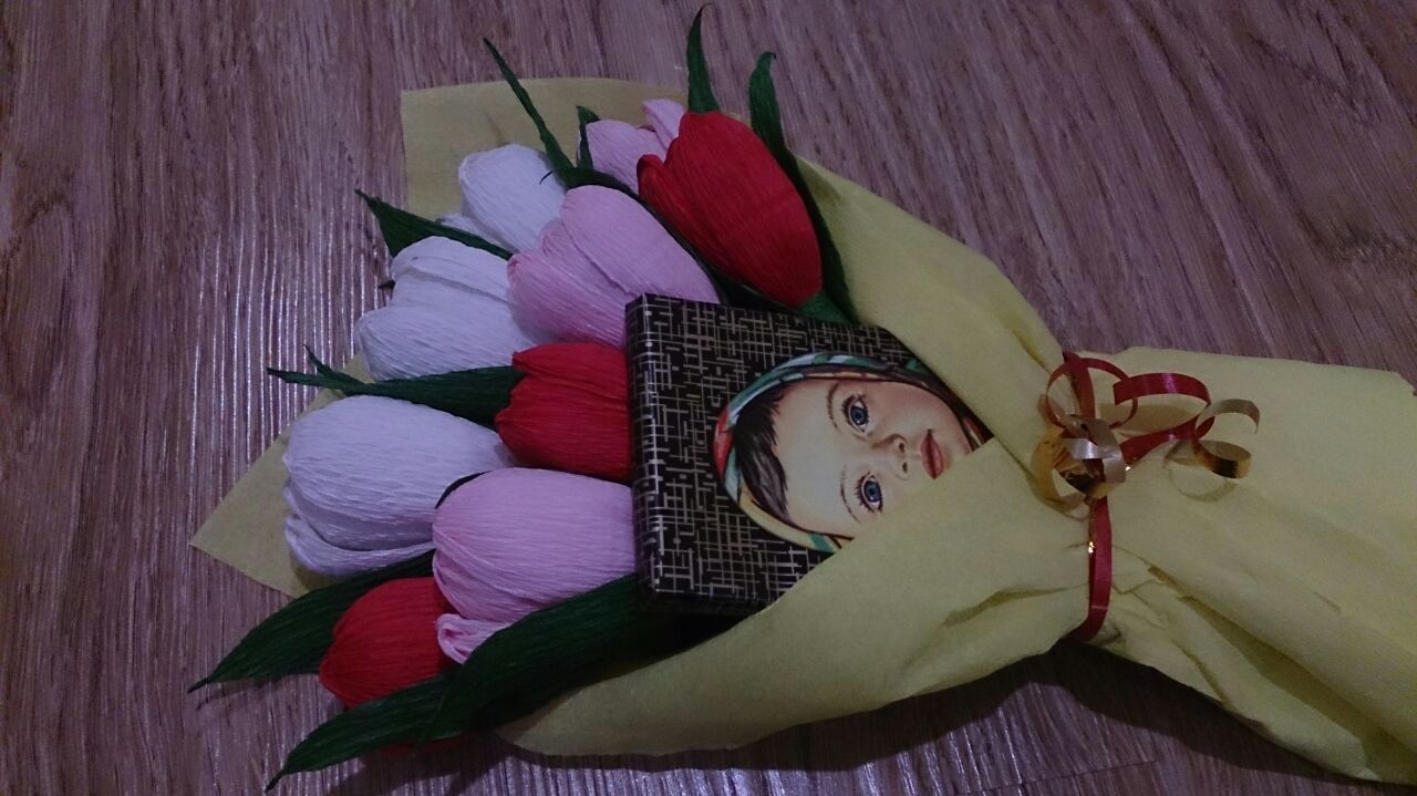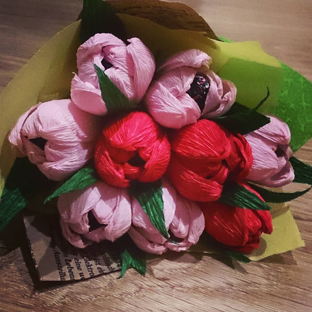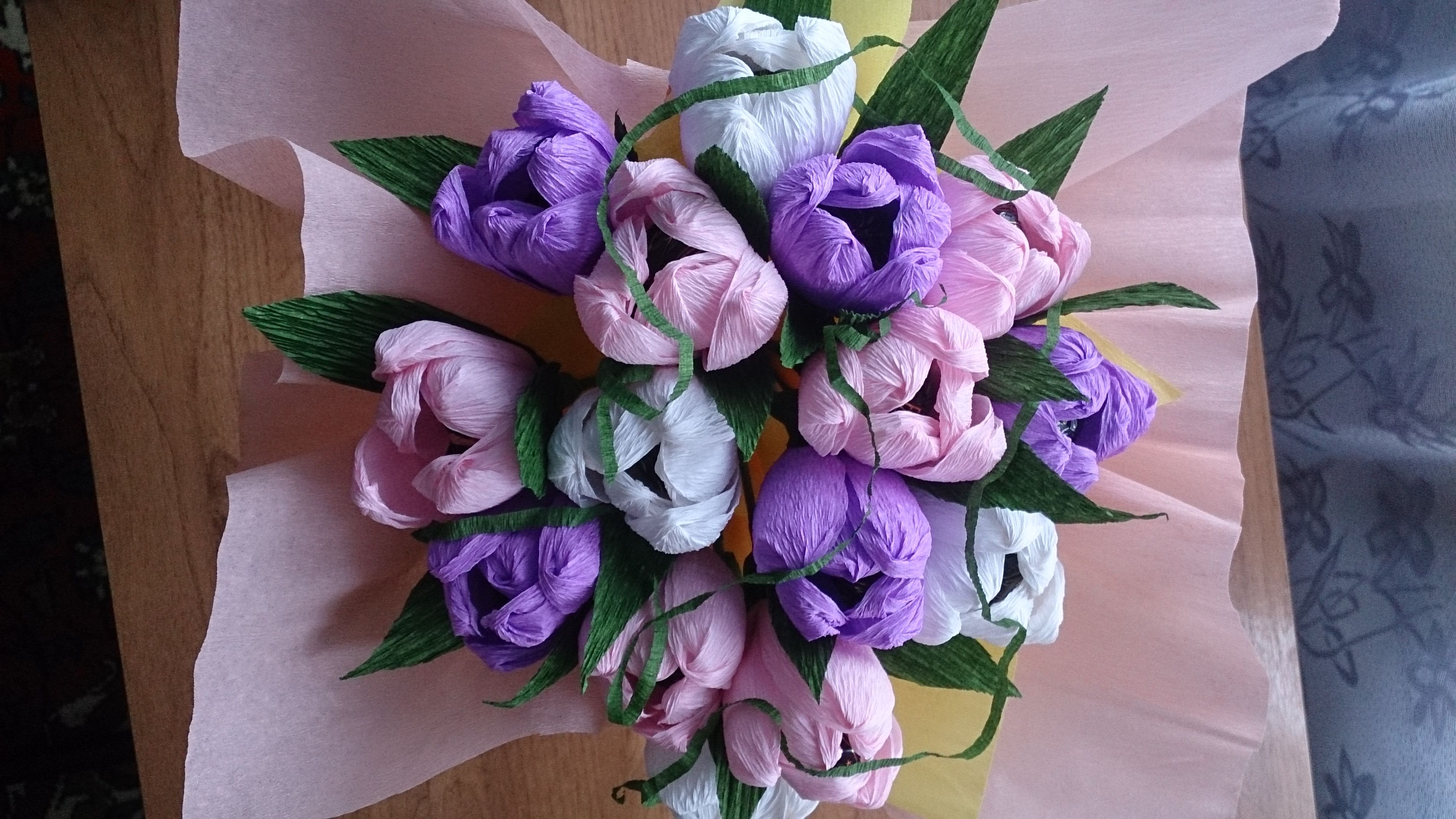 Девочки, принимаю заказы на изготовление букетов из гафрированной бумаги с сладким центром. Цвет и количество цветов в букете по желанию заказчика. Цена зависит от коллектива цветов. Приятный и оригинальный подарок.
