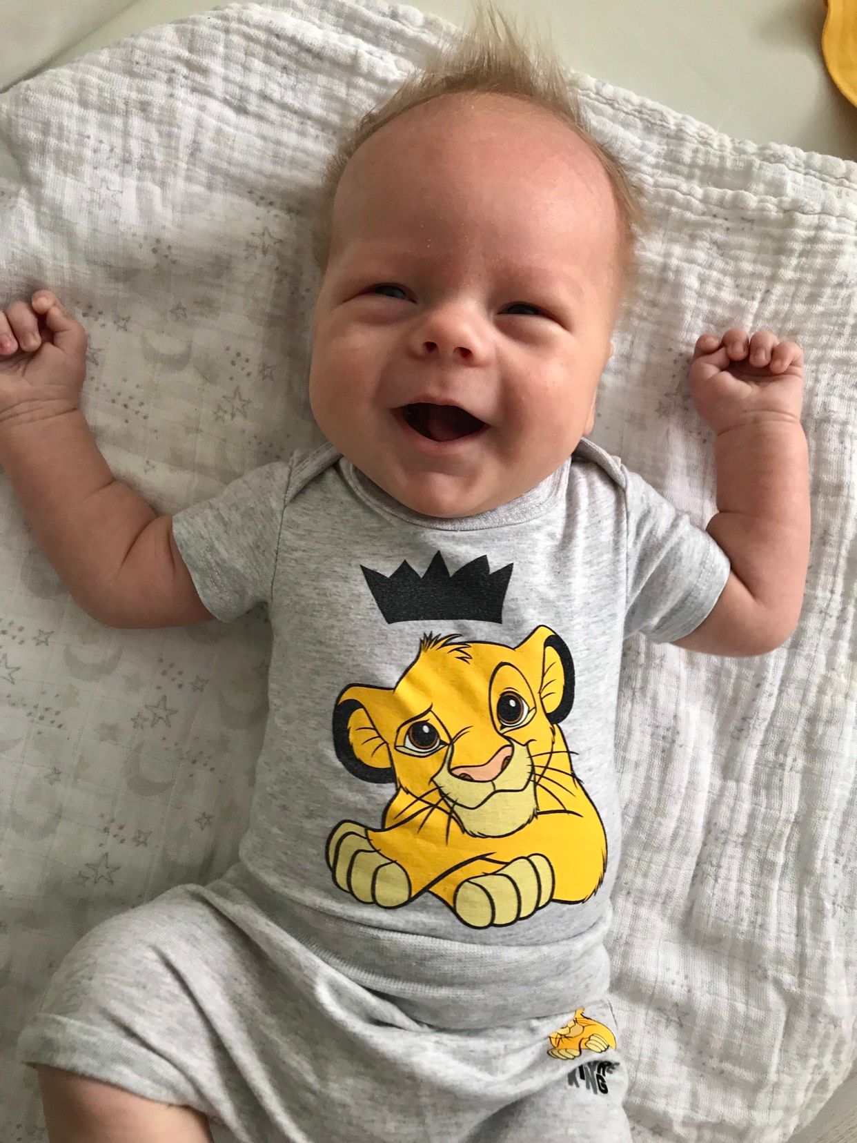 Очень улыбчивый!Болтушка еще та,агукает без перерыва))Любит наблюдать за мобилем в кроватке) Переворачивается со спинки на бочок! Голову держит но не уверенно еще,лентяюшка))