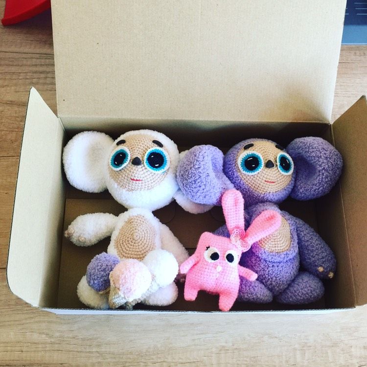 Вот таких Чебурашек я вяжу по МК Александры Конкиной. Крючок 2, тело пряжа Ализе софти, мордочка детская Пехорка, глазки ирис, нос и брови полимерная глина. Игрушки нашли новый дом)