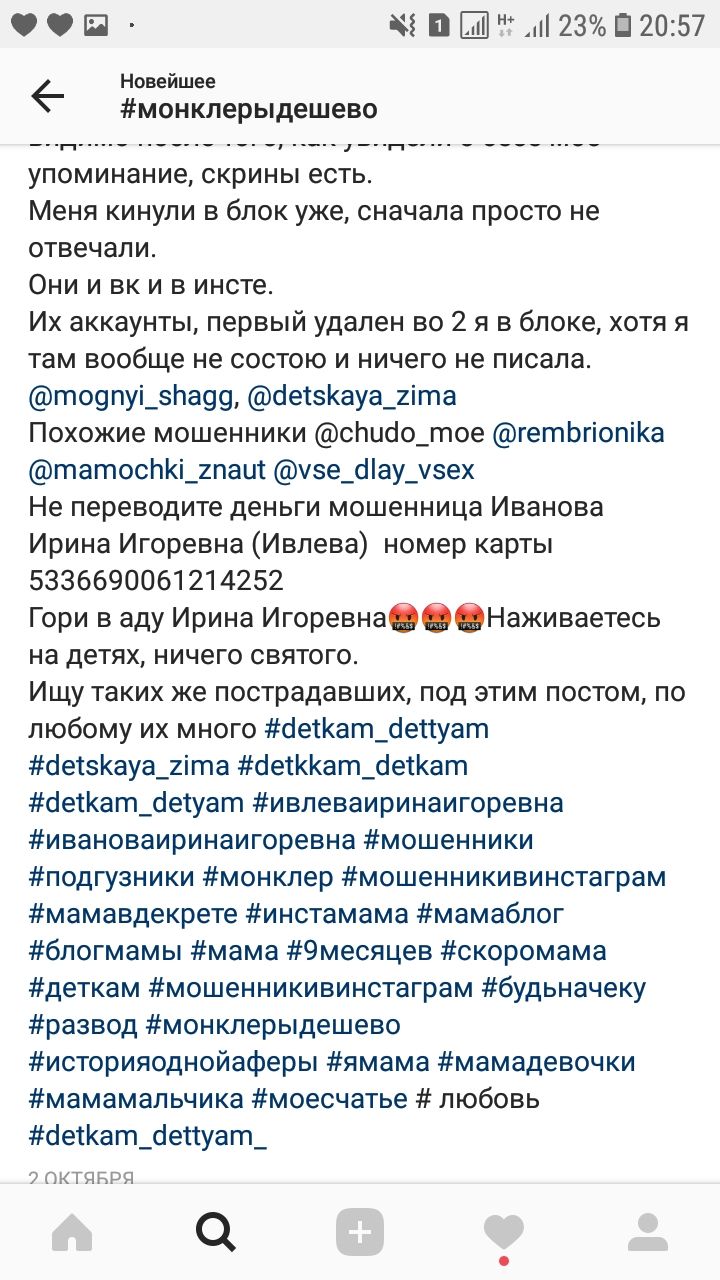 Доброго дня суток!)) Хочу написать о мошеннице в инста. Ее зовут ИВАНОВА ИРИНА ИГОРЕВНА. Она занимается продажей детских товаров. Я наткнулась на нее чисто случайно. Очень большой выбор, хорошие цены. Отзывы и все такое, что вызывает доверие. Сделала … Читать далее